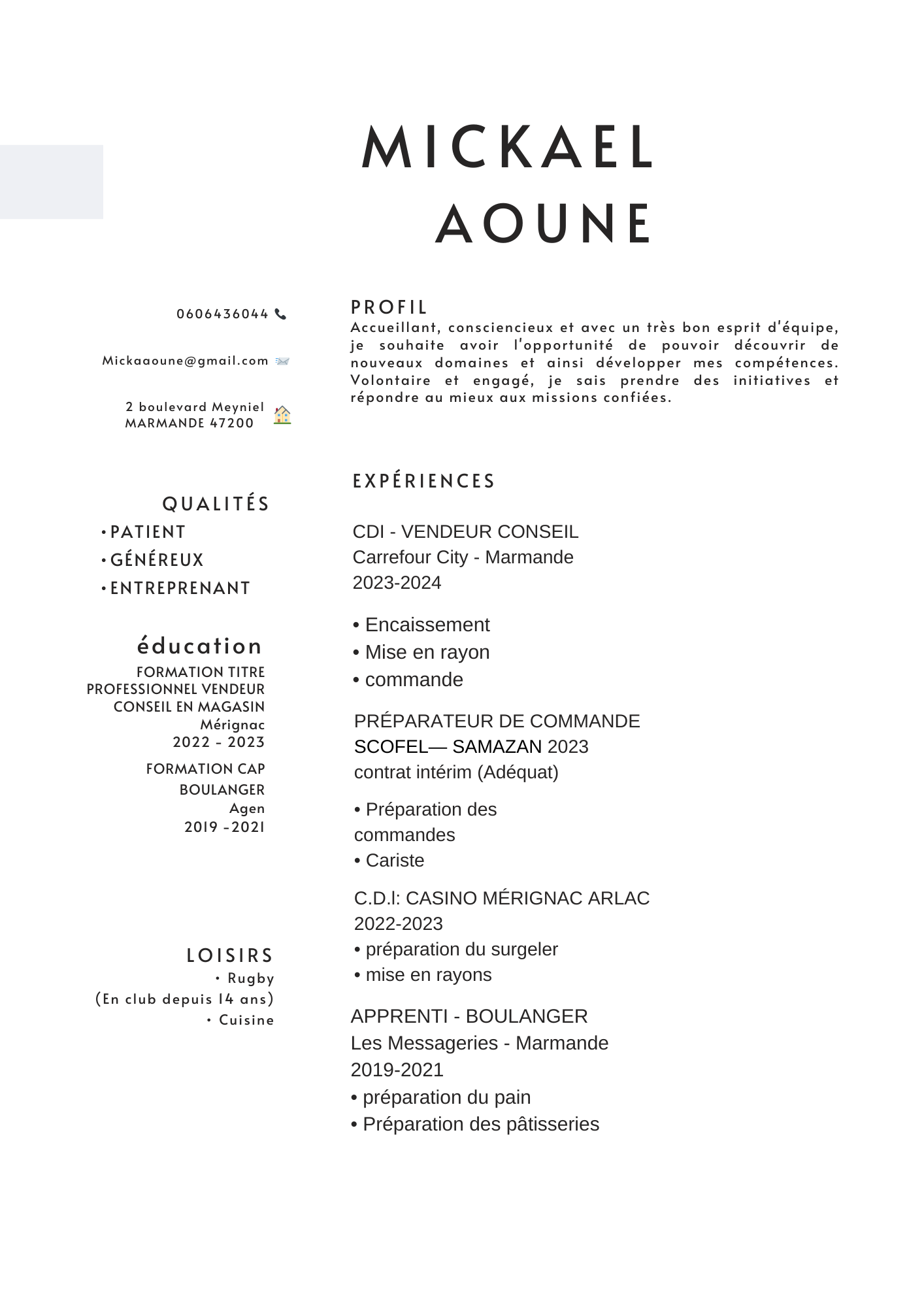 Opérateur de production --- Formation Développement de Structure Sportive --- Gestionnaire d’unité commerciale --- 2015 - Arrivé en France en tant que joueur de rugby professionnel parle et écrit 4 langues Géorgien - Francais - Anglais - Russe