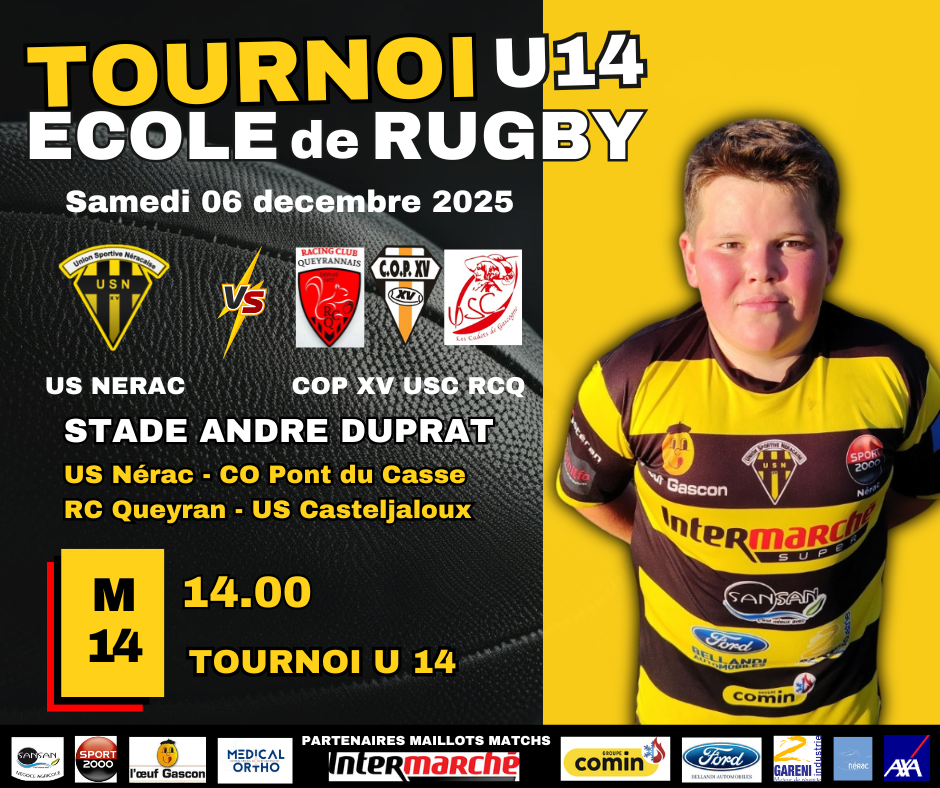 L’École de Rugby de Nérac vous donne rendez-vous ce samedi 06 décembre à 14h00 au Stade André Duprat pour un tournoi U14 placé sous le signe de la passion et du fair-play !