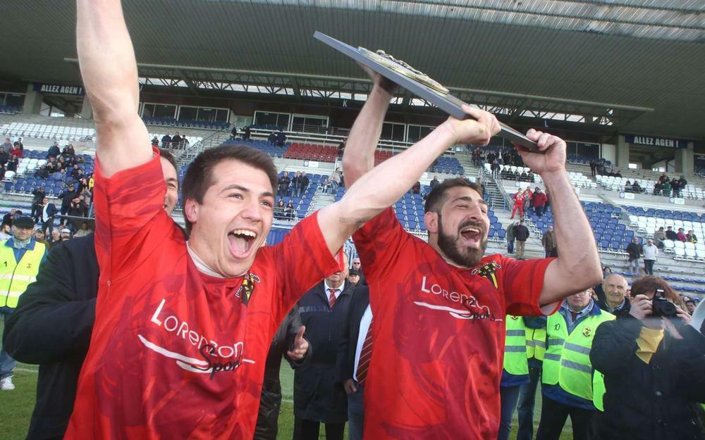 Loin d’être favoris face aux Périgourdins de Lalinde, les joueurs de l’US Nérac ont pourtant dominé la finale de la Promotion Honneur de bout en bout. Au coup de sifflet final, ils l’ont fait : le Bouclier s’élève dans les airs et l’USN obtenait le droit de retrouver la Fédérale 3 (avril 2016). Ce jour-là, le stade Armandie, à Agen, avait pris des airs de fête néracaise. Environ 2 000 supporters avaient fait le déplacement pour soutenir leur équipe. Dans les tribunes, toutes les générations étaient réunies, des fidèles de toujours aux plus jeunes passionnés. Beaucoup de benjamins de l’école de rugby, présents sur les photos de cette finale, portent aujourd’hui le maillot de l’équipe senior, preuve d’un club formateur et fidèle à ses valeurs. (sur la photo le garçon avec le drapeau c'est Louka juniors montant et n° 9 en seniors et juste derrière Aelig Trégouet) En avril 2016, sous la conduite de leur entraîneur Christophe Tarrozzi, les joueurs de l’Albret écrivaient une page marquante de l’histoire du club. Dix ans plus tard, l’US Nérac évolue toujours en Fédérale 3, portée par cet héritage, par son public et par la continuité de son projet sportif. (voir photos en fin de page) |
